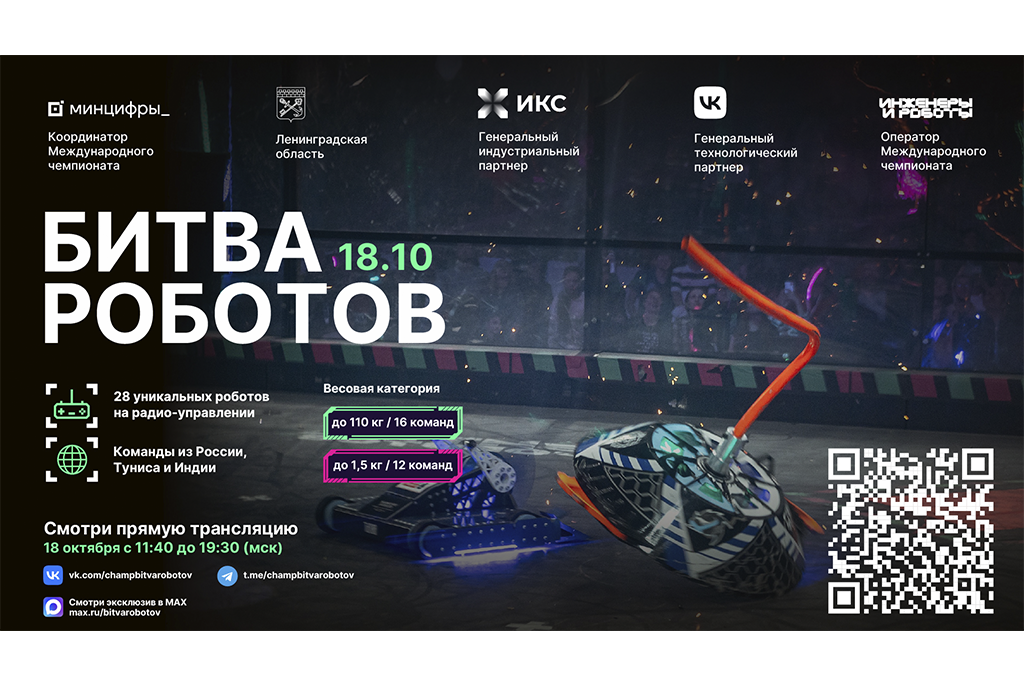18 октября пройдет третий отборочный этап Международного чемпионата по битве роботов сезона 2025 года. Цель Чемпионата – популяризация в Российской Федерации инженерной мысли как драйвера развития и поддержки современных цифровых технологий.