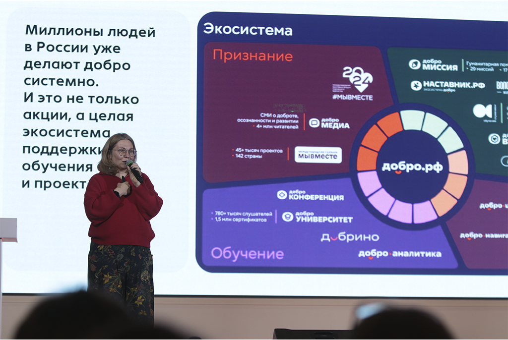 В 2025 году «Добрино» проведет 27 образовательных мероприятий для 6000 участников. При поддержке Совета Федерации ФС РФ состоялась образовательная программа «Хорошее дело», в рамках которой участники и ветераны СВО, женщины из семей военнослужащих создали 24 проекта и открывают 6 новых НКО, направленных на помощь фронту, бойцам и их близким, патриотическое воспитание, сохранение культурных и национальных ценностей. Совместно с ВАРМСУ при поддержке Администрации Президента РФ, госкорпорации «Росатом» реализуется проект «Добрые города» для команд российских городов. В сентябре Ханты-Мансийск прошел Всероссийский форум развития гражданского общества «Добрино» линейки Росмолодежь. Форумы для 500 участников, посвященный теме развития некоммерческого сектора как важнейшего института гражданского общества.