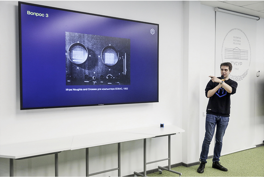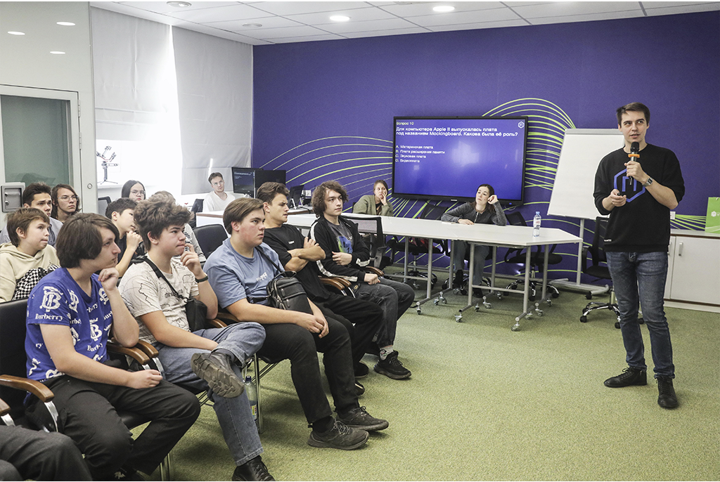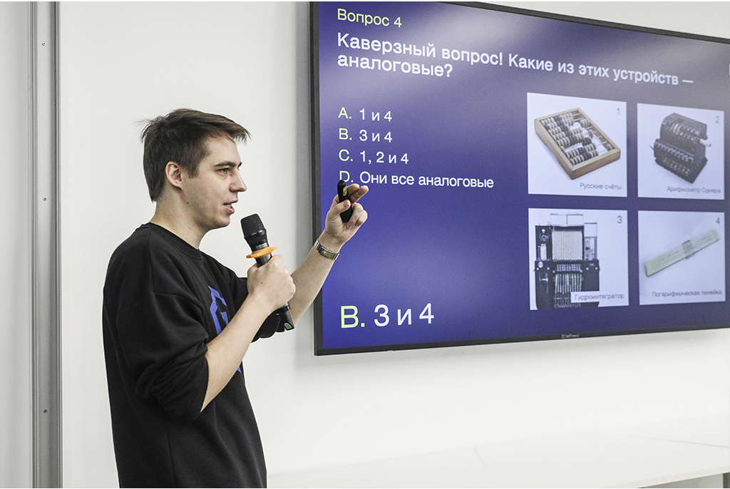 На протяжении часа школьники в формате викторины открывали для себя интересные факты из мира компьютерных технологий. Куратор блока информационно-коммуникационных технологий новой постоянной экспозиции Политехнического музея, исследователь истории вычислительной техники, компьютерный инженер Алексей Бутырин подготовил для участников 15 увлекательных вопросов. Как связано появление компьютеров и пылесос? Какая игра была самой первой, перенесенной на компьютер? В каком необычном проекте поучаствовал советский компьютер в 1968 году? Какое странное требование раньше предъявлялось к жестким дискам? Что в СССР потребовали от компании, разработавшей первую коммерческую версию игры «Тетрис»? Ответы и комментарии эксперта помогли участникам погрузиться в историю развития технологий, без которых сегодня мы не можем представить свою жизнь.